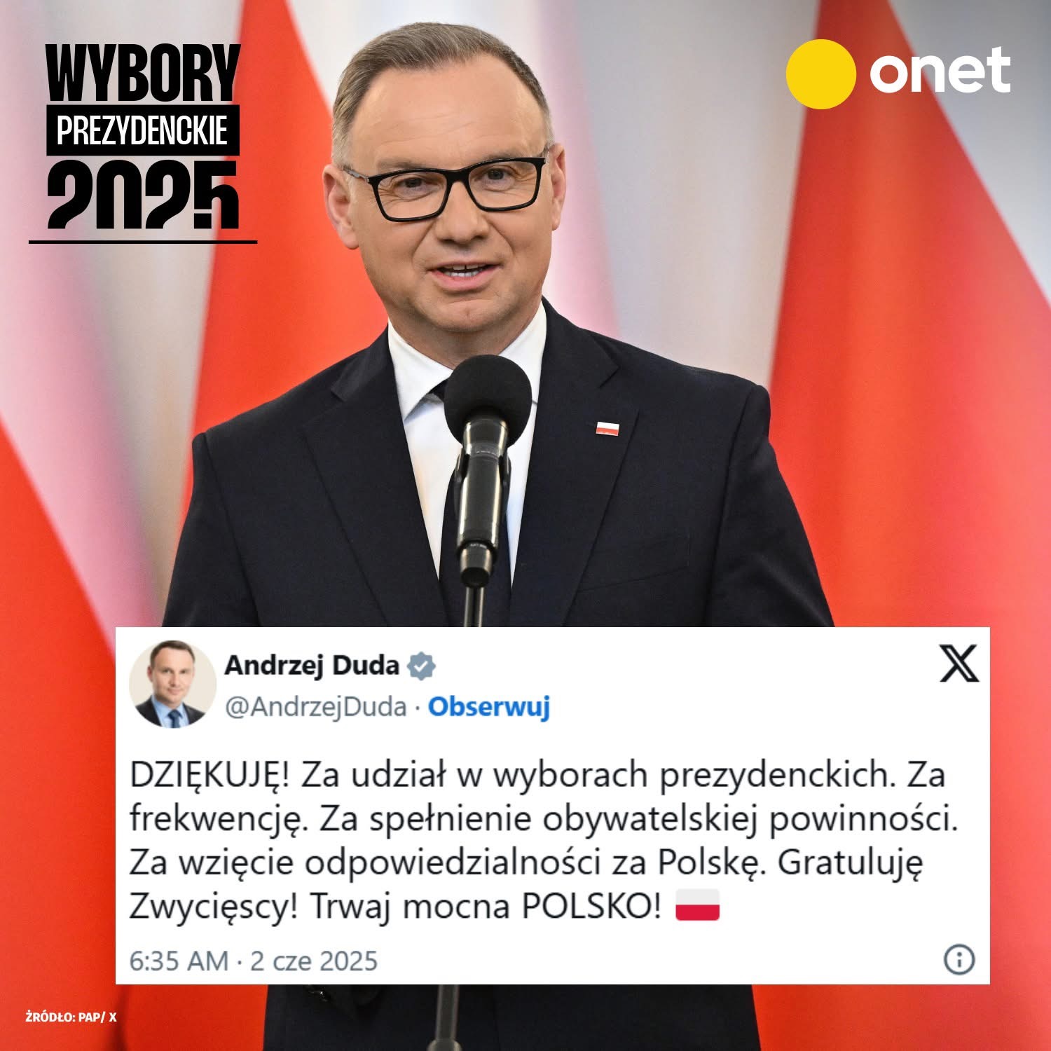 Read More“DZIĘKUJĘ! Za udział w wyborach prezydenckich. Za frekwencję. Za spełnienie obywatelskiej powinności. Za wzięcie odpowiedzialności za Polskę. Gratuluję Zwycięscy! Trwaj